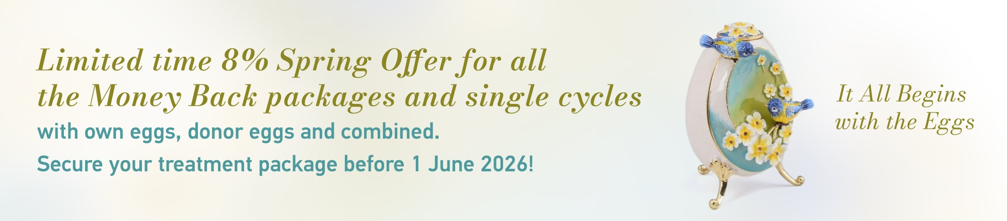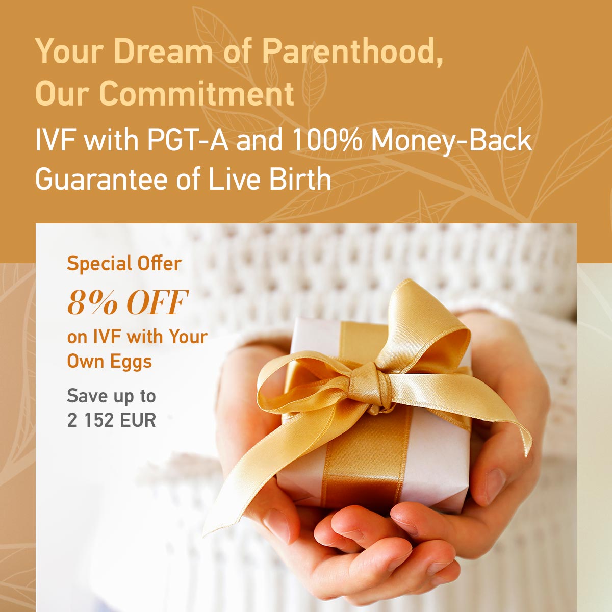 100% Money Back Guarantee of Live Birth means: if no baby is born within a fixed number of attempts included in the package, we refund 100% of the costs paid for the package.